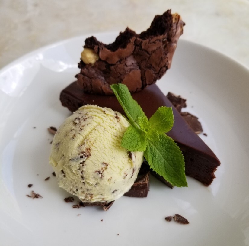 The flourless chocolate cake is baked in a water bath. When it is cooled it is coated with chocolate glaze then sliced. The ice cream is made with fresh mint that is infused into the cream while the custard base is cooking, giving it a natural mint flavour. Once the ice cream has been churned, shaved chocolate is folded in. The cake is topped with a piece of gluten free cookie with white chocolate chips. The plate is garnished with chocolate chunks and fresh mint.