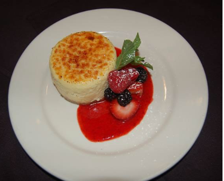 Cheesecake: Our house made cheesecake, made with Ricotta and cream cheese, is very creamy and much lighter than the traditional N.Y. style cheesecake. It is served with a caramelized sugar top, a strawberry puree and fresh seasonal berries.