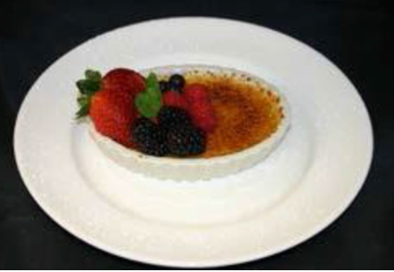 1 regular sized Crème Brulée is a lightly baked custard with a caramelized sugar glazed top, made in house and served chilled with seasonal berries.