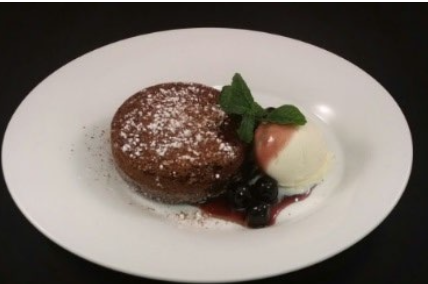 Double warm chocolate cake is baked to order, drizzled with Amarena Port Cherries and house made vanilla ice cream.