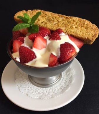 Fresh strawberries with Crème Anglaise served with almond Biscotti.