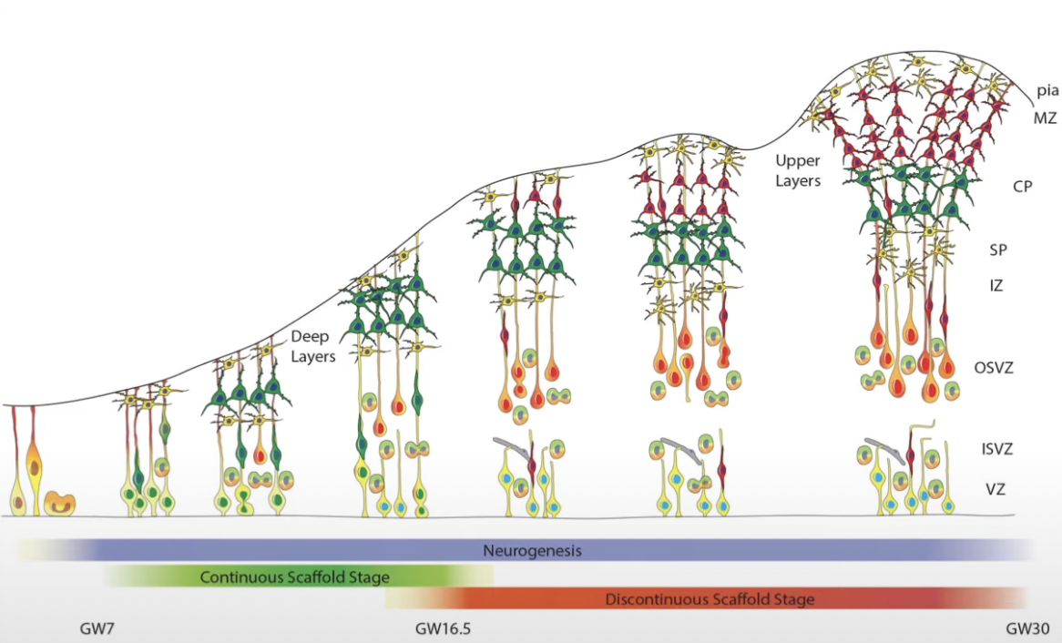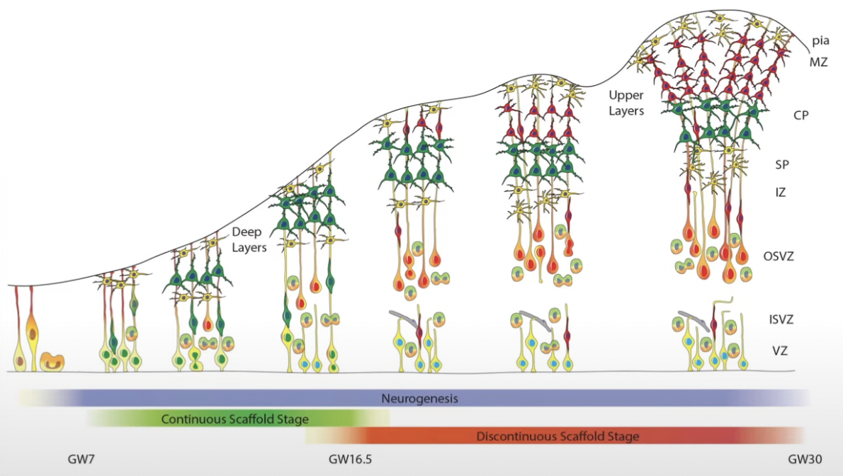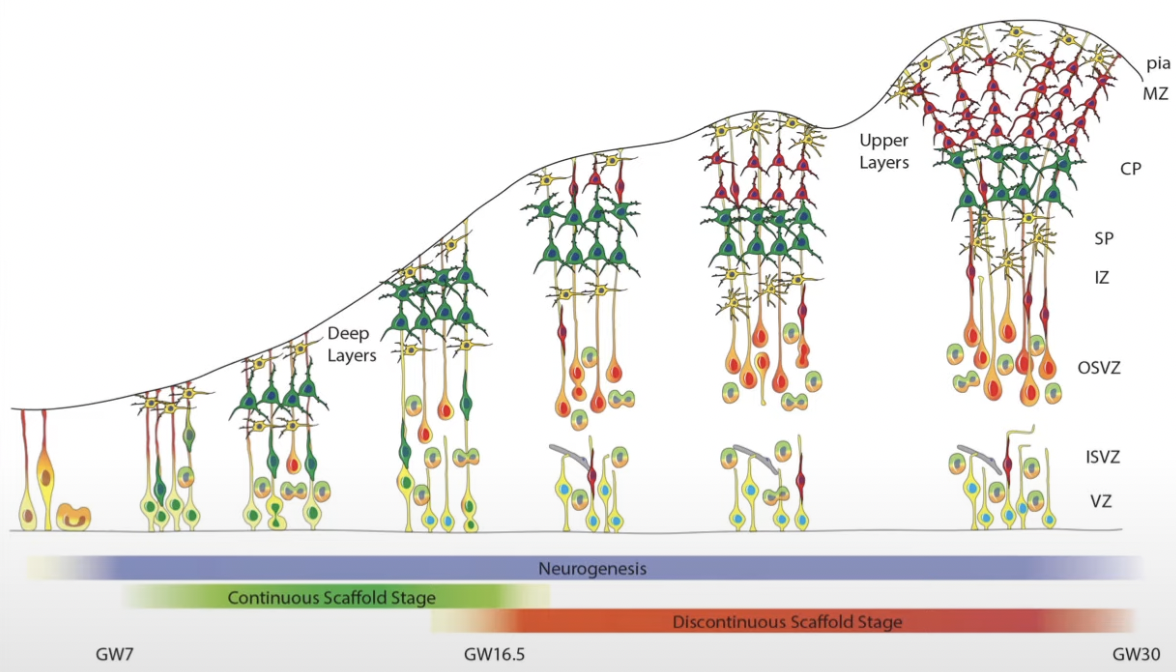 Around this week, radial glial cells reach into the OSVZ and oRGs extend from the OSVZ to the pial surface, this also coincides with the formation of layer 4.
