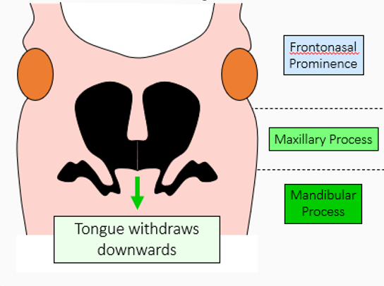 continued foetal development of the oro-naso cavity results in the withdrawl of tongue inferiorly