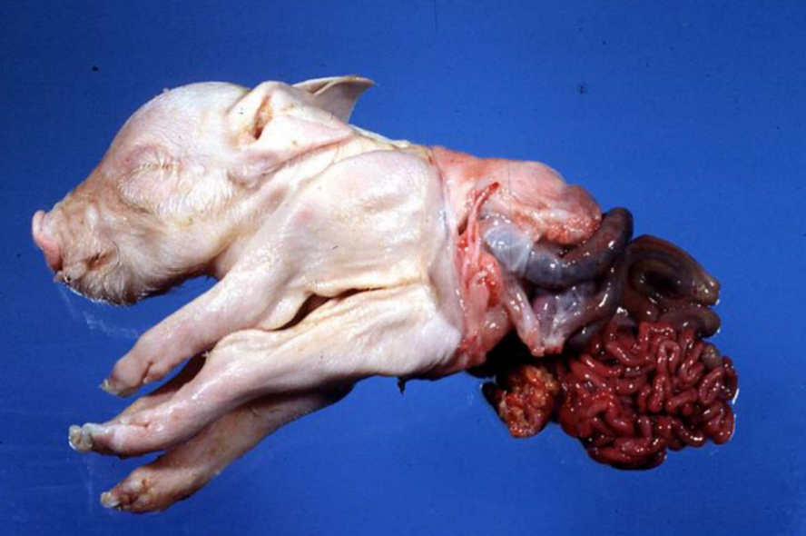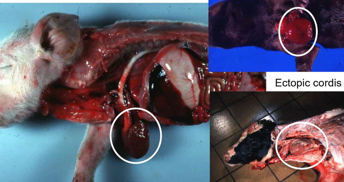 Variable features include cleft sternum and exposure of thoracic viscera, scoliosis, and digestive urogenital defects