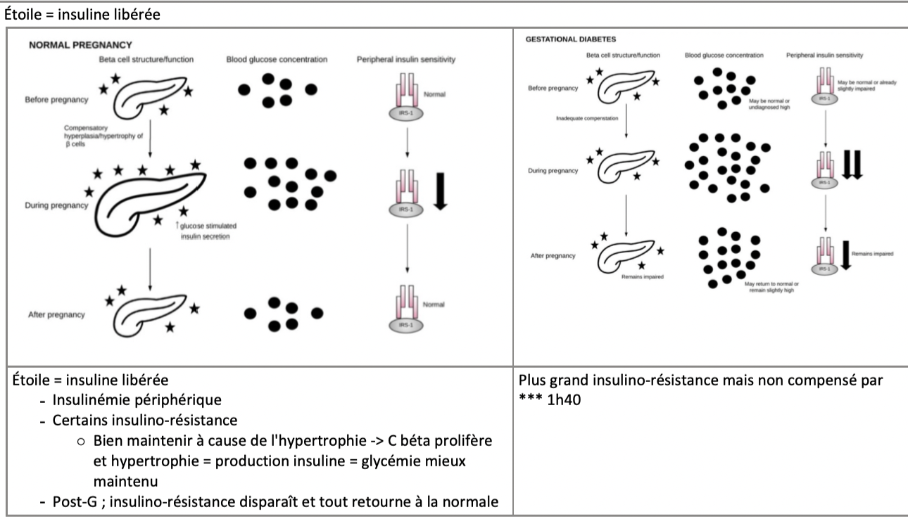 - Pour maintenir l’homéostasie glucose, les F enceintes compensent ces changements par l’hypertrophie & hyperplasie des cellules β pancréatiques, ainsi que par une aug de la sécrétion d’insuline stimulée par le glucose.