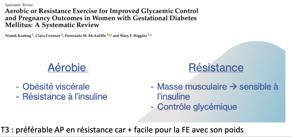 - Le cyclisme rég d’intensité modérée à une fréquence d’au moins 3 x/sem/min 30min commencée en début de G, était sûr et efficace pour prévenir le DG chez les F enceintes en surpoids et obèses.