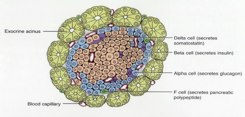 What are the different cells contained within the islets of langerhans?