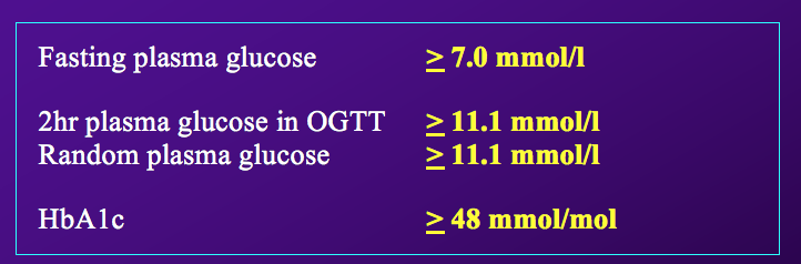 Lines are drawn where complications (microvascular) of diabetes occur- these shown are fasting blood glucose. > 7 mmol/L