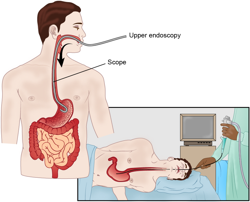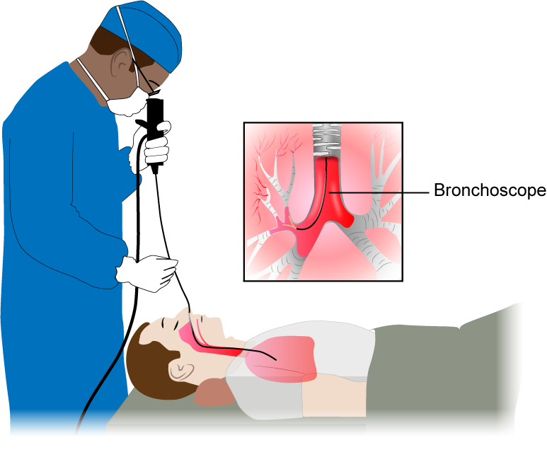 An endoscope or bronchoscope is a flexible tubing with a camera/scope on the end that is inserted into the mouth to visualize the insides of a client.