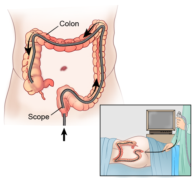 A flexible tubing with a camera/scope on the end inserted into the colon and large intestine.