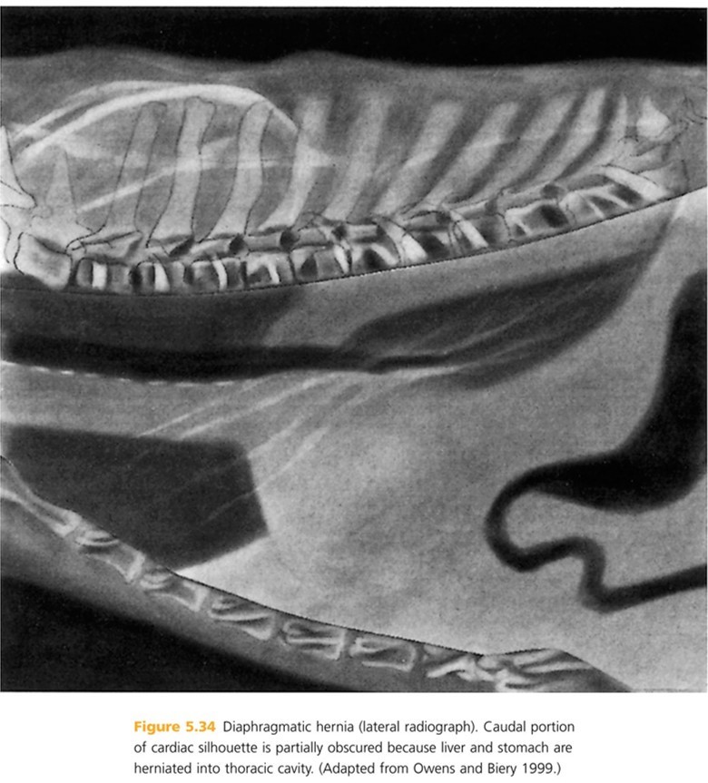 May be conginital or aquired. Affects both cats and dogs (may be hereditary in Chinese shar pei). Seen in younger animals. Hernia occurs through normal hiatus in diaphram. May be para-esophageal, para-aortic, or paravenous (adjacent to vena cava). Frequently the hernia is “sliding”. Most common = abdominal portion of esophagus or part of stomach proturdes into caudal mediastinum through esophageal hiatus.