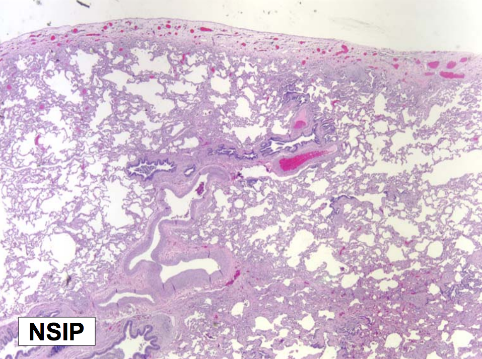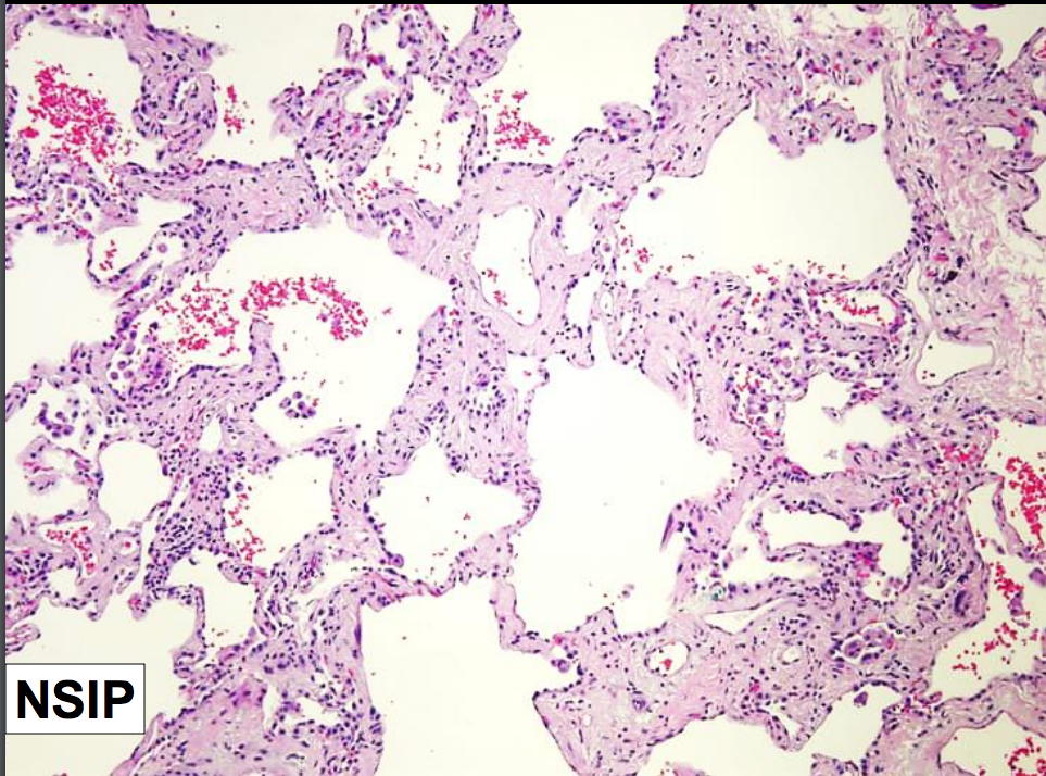 Nonspecific interstitial pneumonia (NSIP) is a chronic fibrosing interstitial lung disease that lacks characteristics of the other wellcharacterized (specific) diseases. It can be idiopathic, or may occur in the setting of an underlying connective tissue disease.