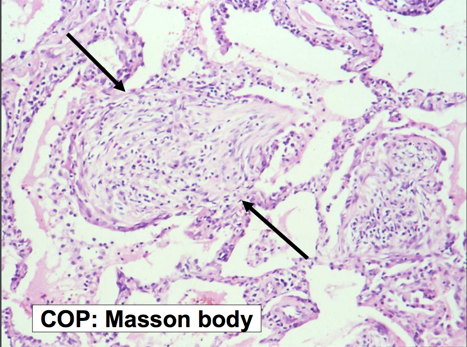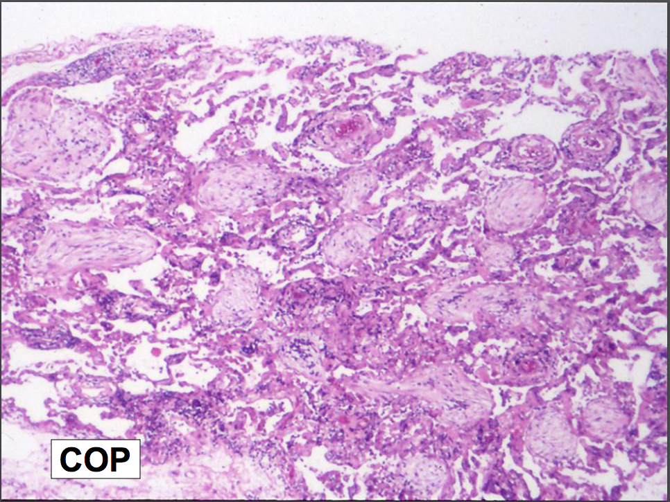 Cryptogenic organizing pneumonia (COP) is a restrictive lung disease of unknown (idiopathic or cryptogenic) cause, characterized by injury to the lung that results in filling of alveoli and terminal bronchioles by plugs of proliferating fibroblasts (“organization”).