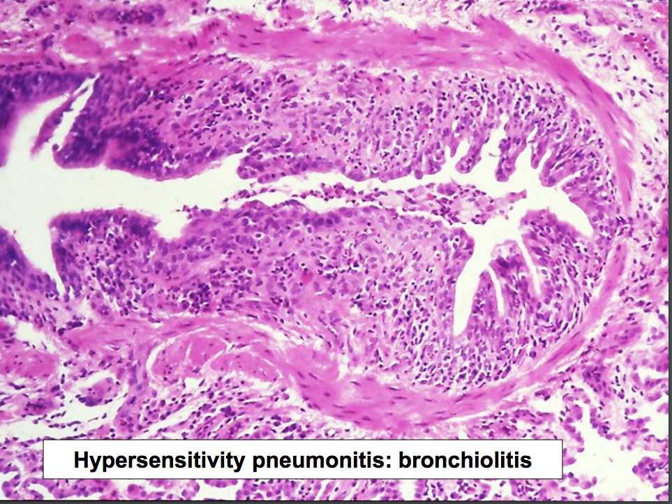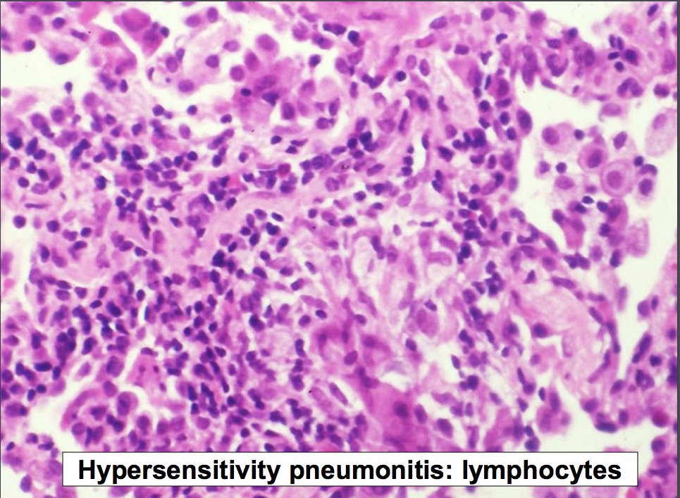 Hypersensitivity pneumonitis (HP) is the term used for a group of related acute to chronic interstitial lung diseases, caused by heightened sensitivity and an inappropriate inflammatory reaction to inhaled organic antigens. Specific diseases are named after their etiologies (e.g., bird-fancier’s lung from exposure to avian protein antigens). Initial lesions lack mature fibrosis and are reversible, but mature fibrosis with a pathologic UIP pattern can occur with repeated attacks.