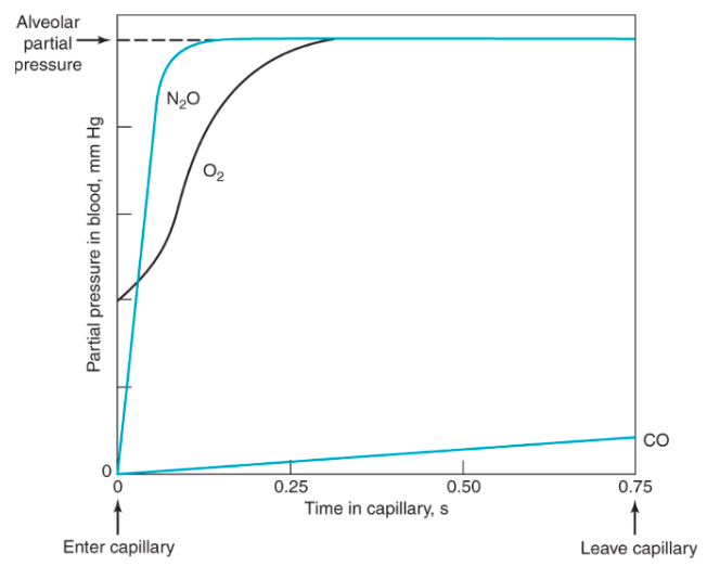 CO never equilibrates with the plasma because it’s so rapidly removed from it by hemoglobin, so the amt of CO in th eblood depends only on how quickly it diffuses across the alveolar capillary barrier.