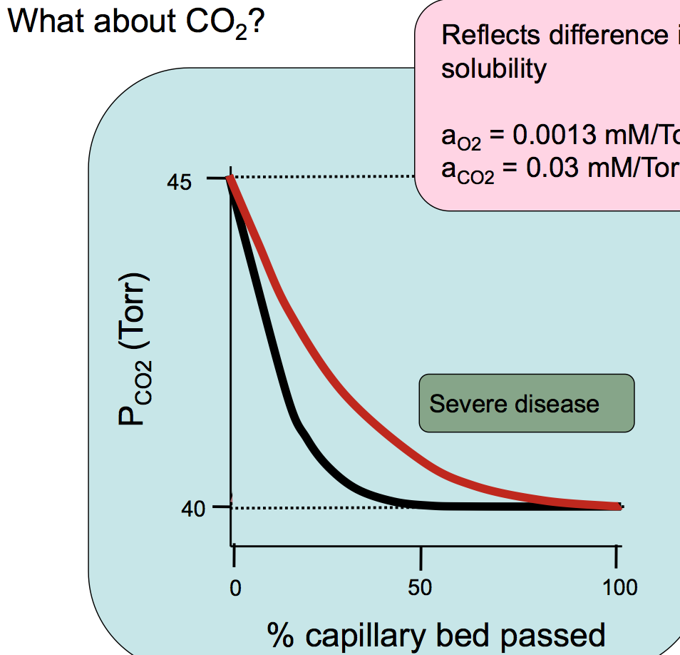 CO2 passes READILY from blood to interstitium to alveolar space without trouble so diffusion disorders don’t affect CO2 diffusion sufficiently