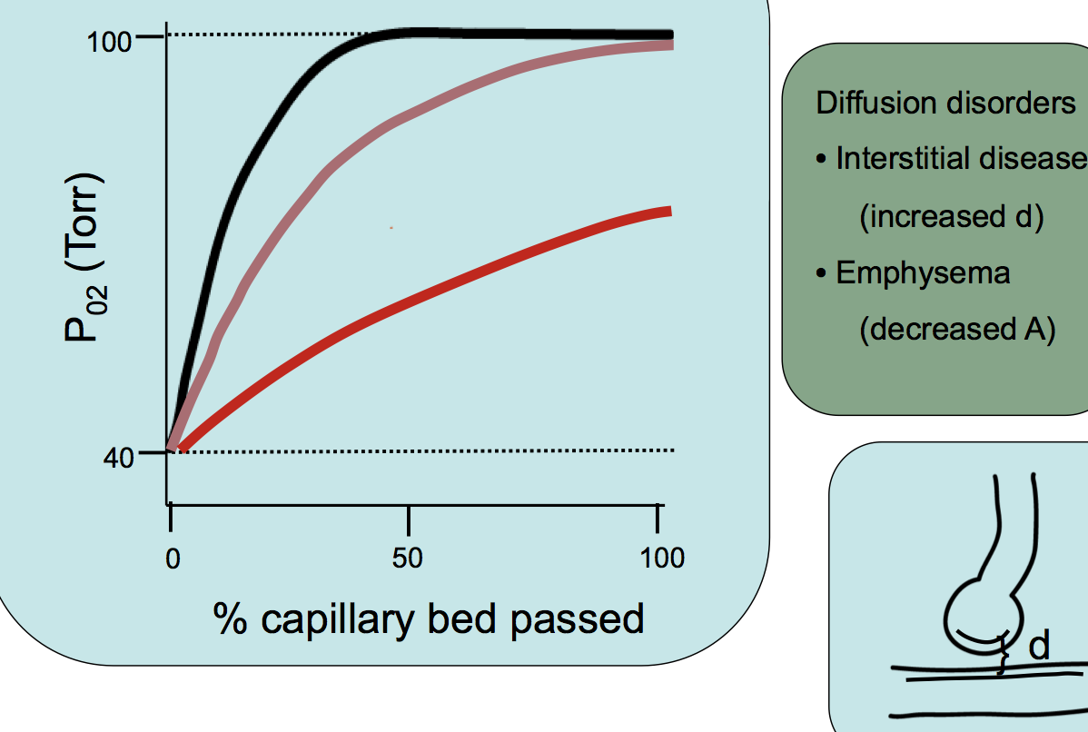if you have moderate disease or exercise that impedes diffusion, then curve of PO2 vs. % capillary bed passed shifts down, still able to reach 100% PO2