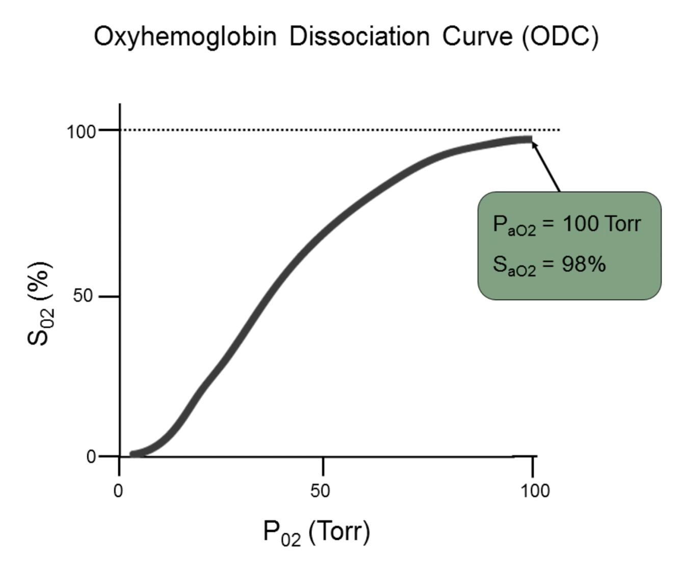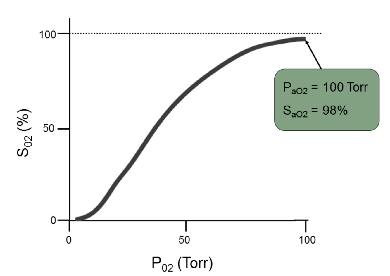 The diagram below demonstrates how at a normal PaO2 of 100 torr, saturation of hemoglobin binding sites is about 98%