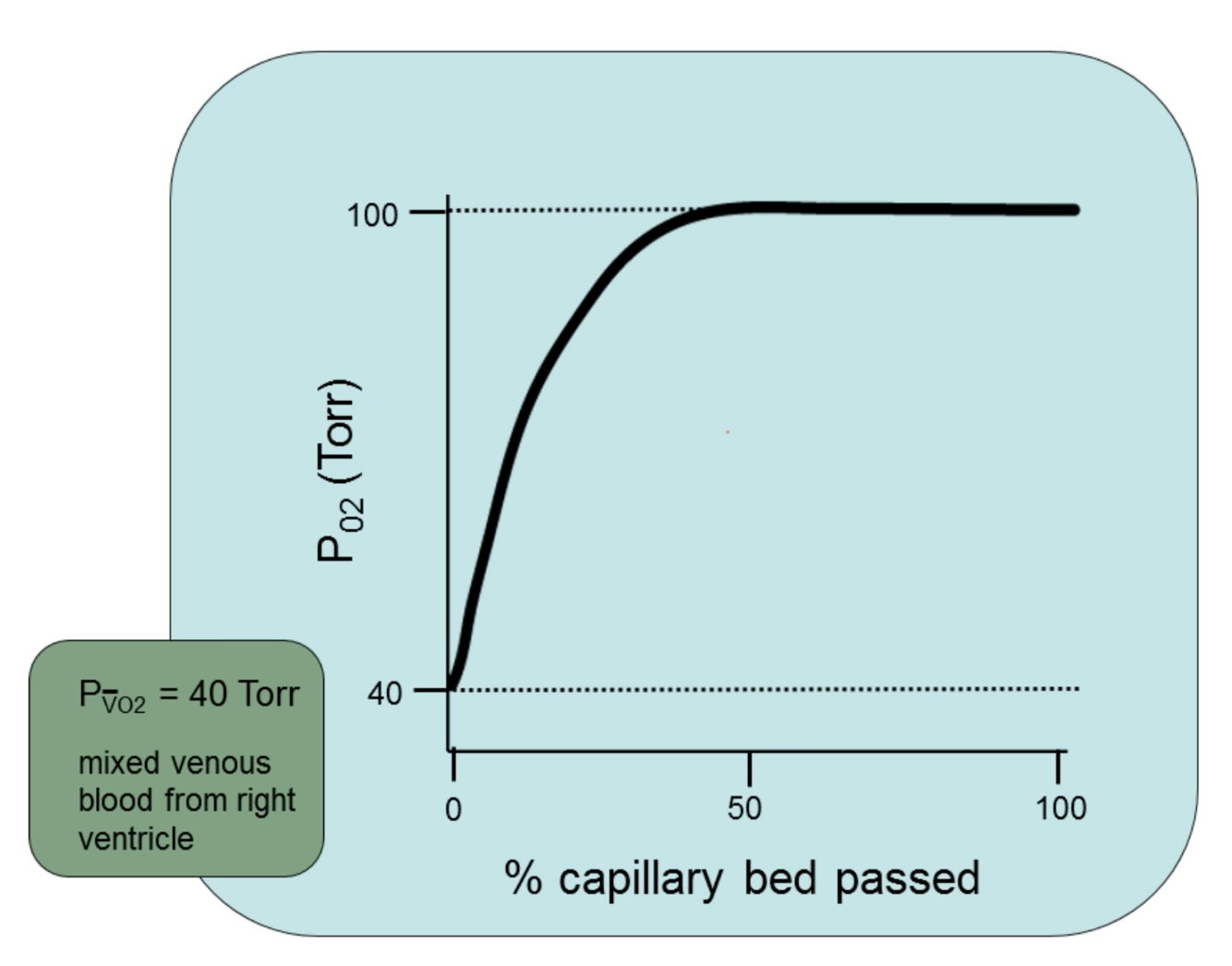 The diagram shows how blood arriving from the right ventricle is has a partial pressure of oxygen of about 40 torr and it is increased to a partial pressure of 100 torr by the time it passes through about a third of the pulmonary capillary beds.