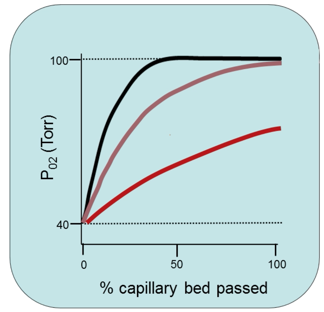 The pink line shows what the curve may look like in a patient with moderate disease or a patient during exercise. In moderate disease, the diffusion rate may be slowed down but the patient could still oxygenate the blood to 100 torr. During exercise, the diffusion rate is also decreased because the blood is moving faster and has less time to oxygenate.