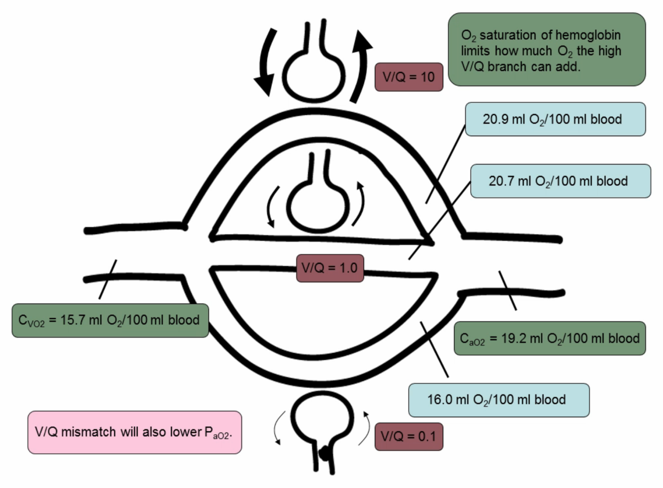 Look at the attached diagram, you can see that while the V/Q ratio of the top unit is 10 times that of a normal V/Q ratio, the oxygen content resulting from that is not substantially higher.
