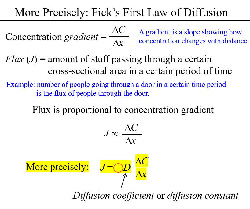 Describe Fick’s First Law of Diffusion. What is flux and how does it change with concentration gradient?