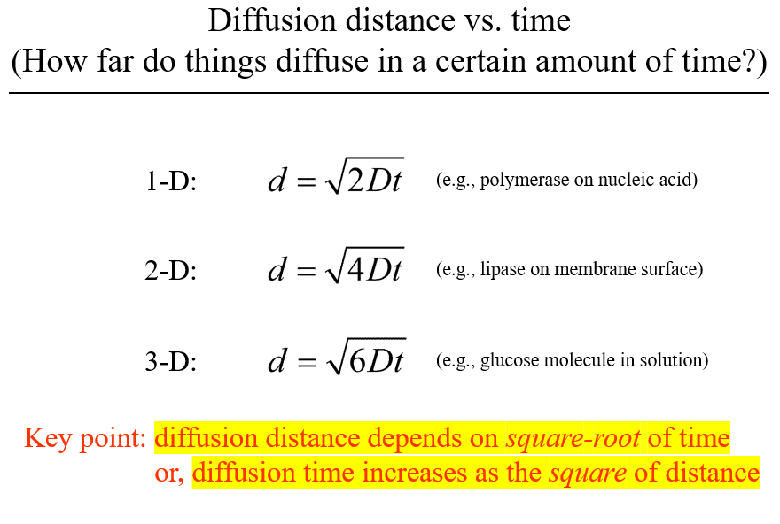 Describe the relationship between the diffusion distance of a molecule and time taken to diffuse. If the distance d travelled by a molecule is 100um and the diffusion coefficient is 500um2, how would you find the time taken to diffuse over 100um?
