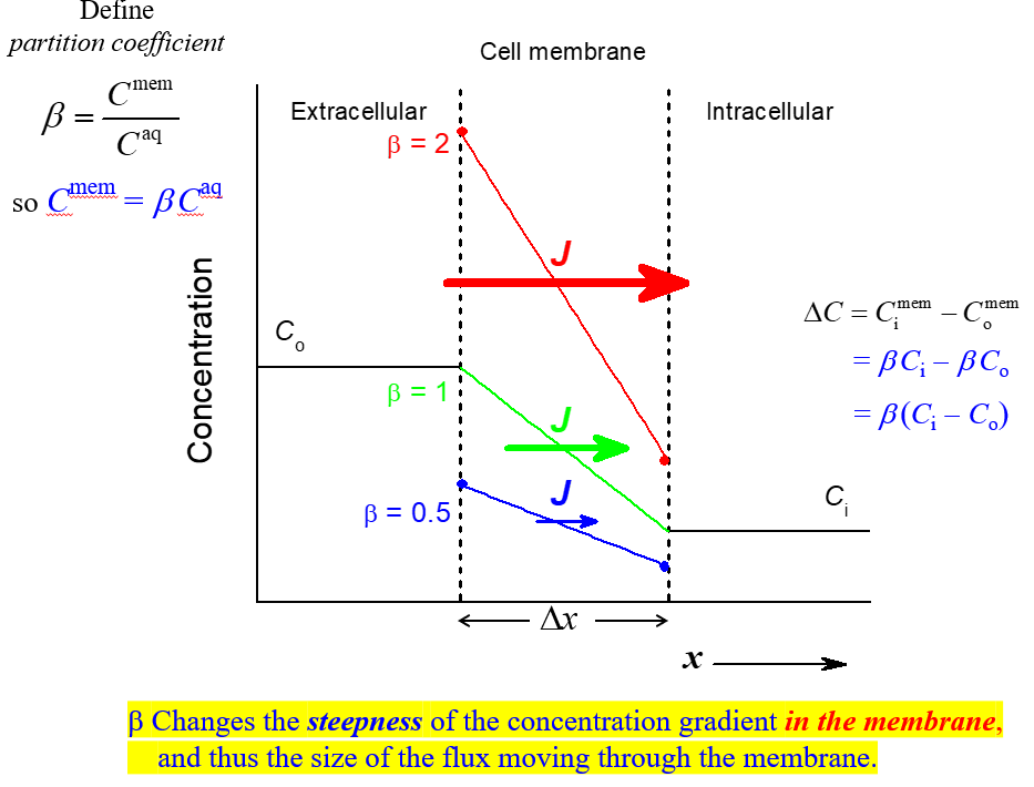 What is the significance of the partition coefficient and what is its effect on flux and the concentration gradient?