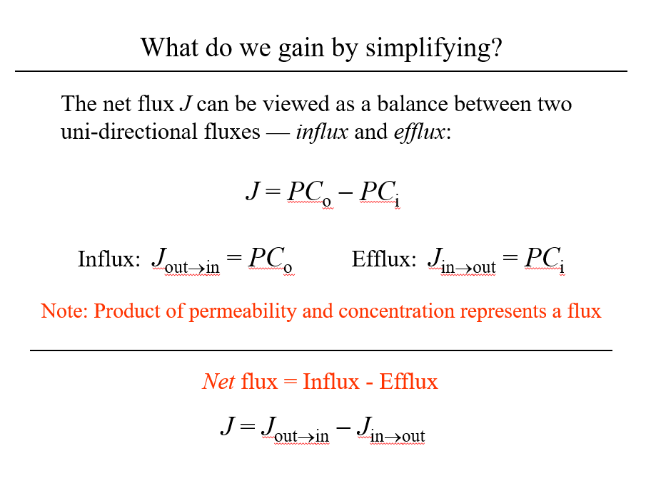 Describe influx vs efflux in the context of permeability and Fick’s diffusion law