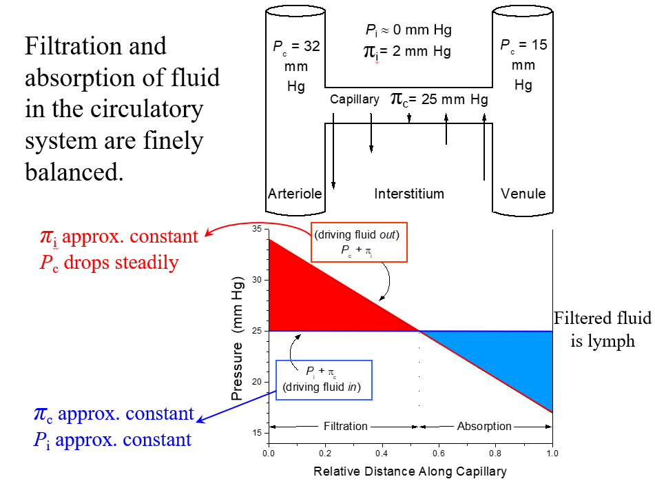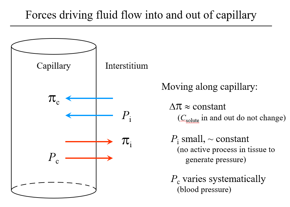 Using a drawing, describe fluid flow in the capillaries. How do the values of interstitial and capillary hydrostatic and osmotic pressure change, if at all?