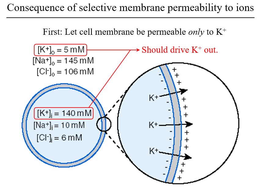 For a cell that has a high intracellular K+ concentration, low intracellular Na+ and Cl- concs and is only permeable to K+, describe how you would reach equilibrium? (i.e what is the role of the K+ concentration gradient and the electrochemical gradient?)