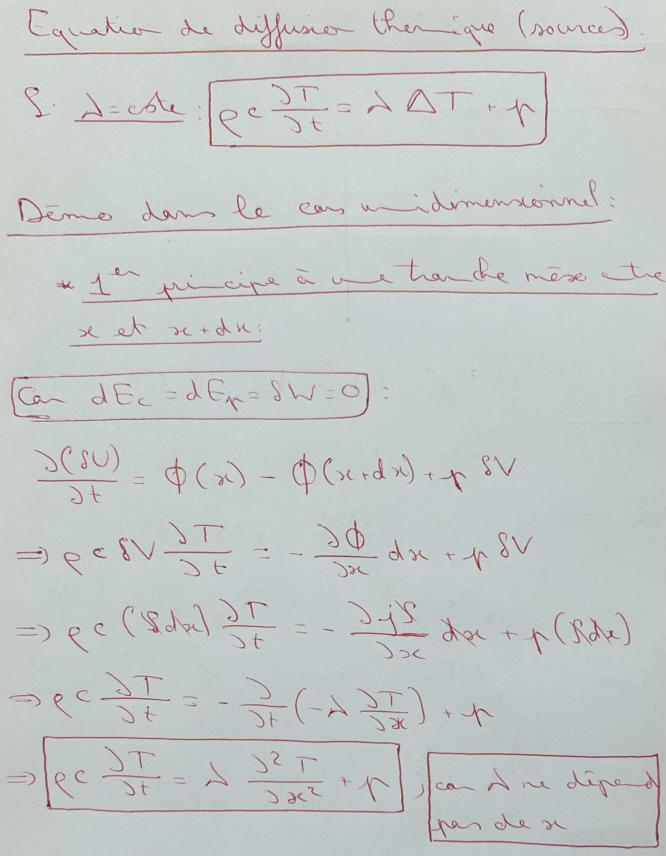 Donner l’équation de diffusion thermique avec sources puis la démontrer dans le cas unidimensionnel