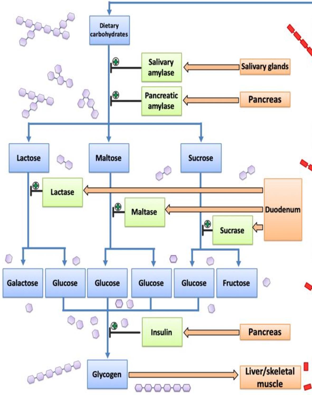 Describe the digestion and absorption of dietary carbohydrates.