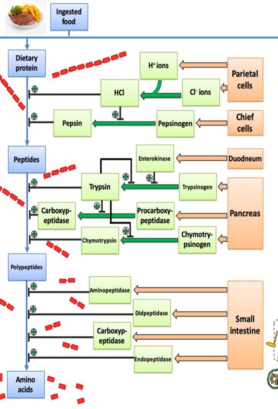 Describe the digestion and absorption of dietary protein.