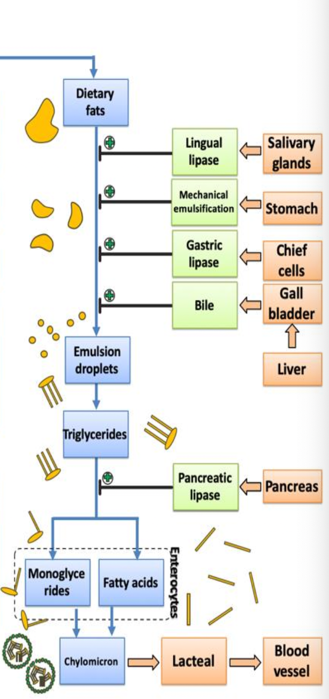 Describe the digestion and absorption of dietary fats.