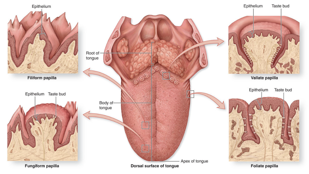 dorsal surface of the tongue, in elevated epithelial and CT called Papillae