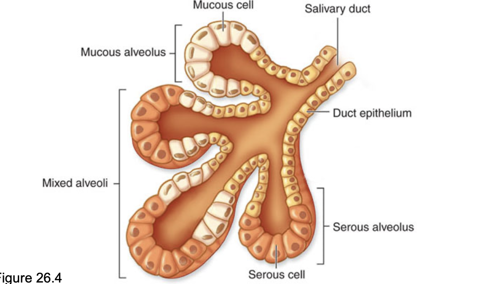 Serous cells: secrete watery fluid containing ions, lysozymes and salivary amylase