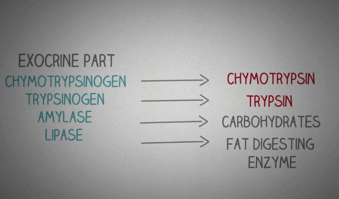 The pancreas has an exocrine which secretes digestive enzymes and endocrine part which produces insulin and glucagon