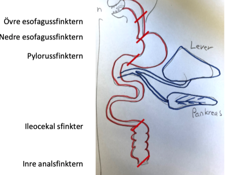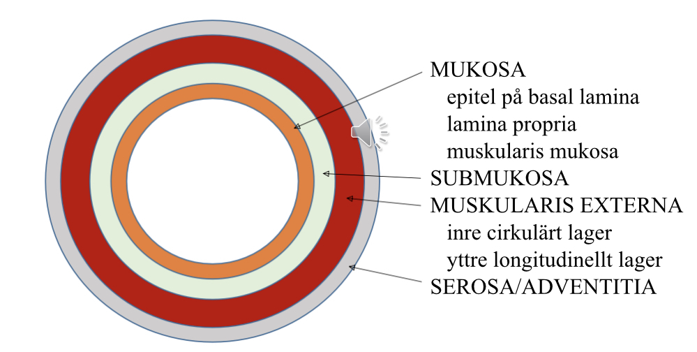 Muscularis externa — tre lager av glattmuskelceller — inre med oblique, mellan med cirkulär, yttre med longitudinell fiberriktning — Auerbach’s plexa mellan lagren