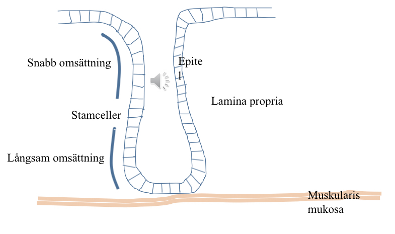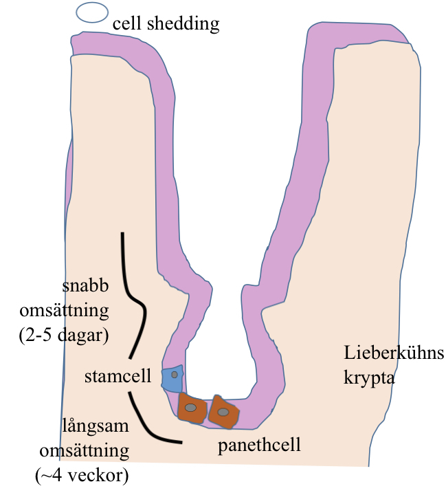 Stamceller — placerade ett par celler från kryptans botten, prolifererar långsamt, ger upphov till alla celler i tarmepitelet, bildar “intermediate cells” innan de differentierar till enterocyt eller bägarceller