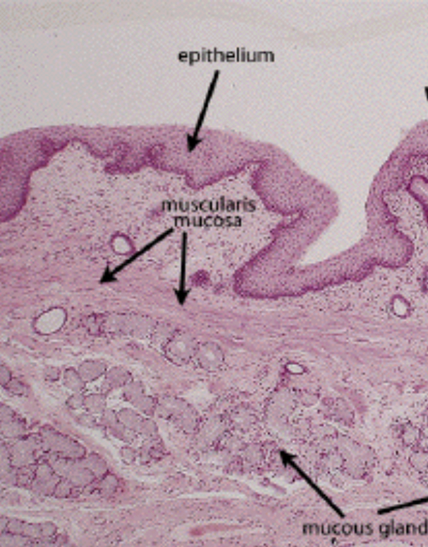 Mukosa — flerskiktat oförhornat skivepitel, lamina propria, muscularis mucosa