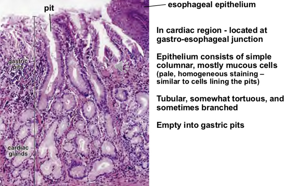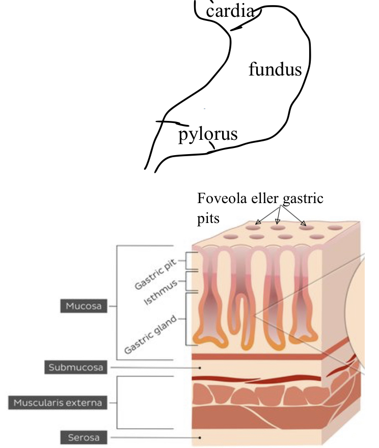 Delas upp i tre regioner med distinkt histologi — cardia, fundus och pylorus