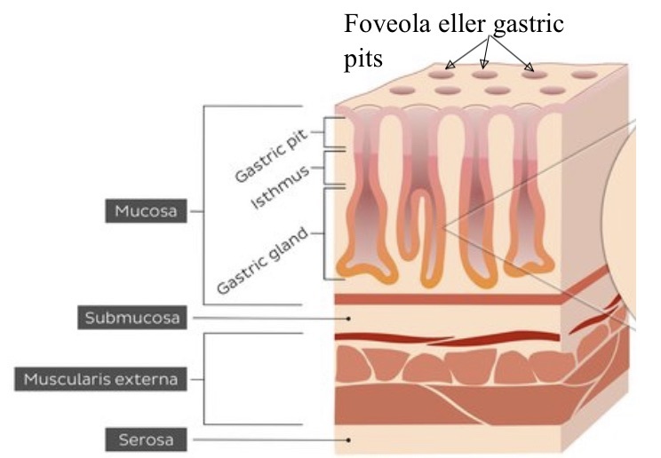 På ventrikelns yta finns små gropar — foveola eller gastric pits — mynningarna ligger i mukosan och producerar magsaft (fundus) eller slem (cardia och pylorus)
