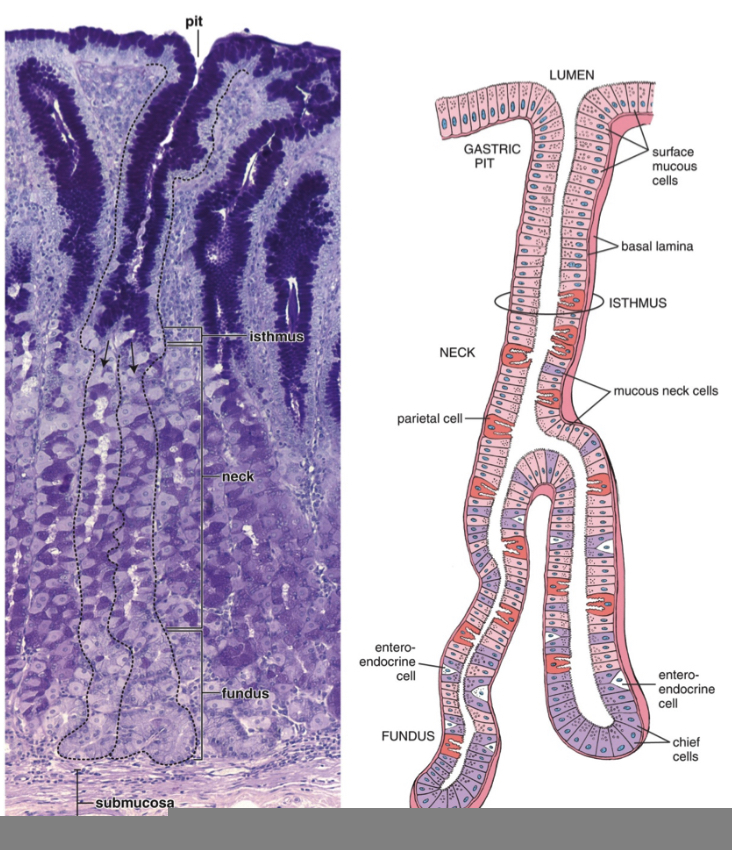 Isthmus = zon mellan gastric pit och funduskörteln — innehåller stamcellerna