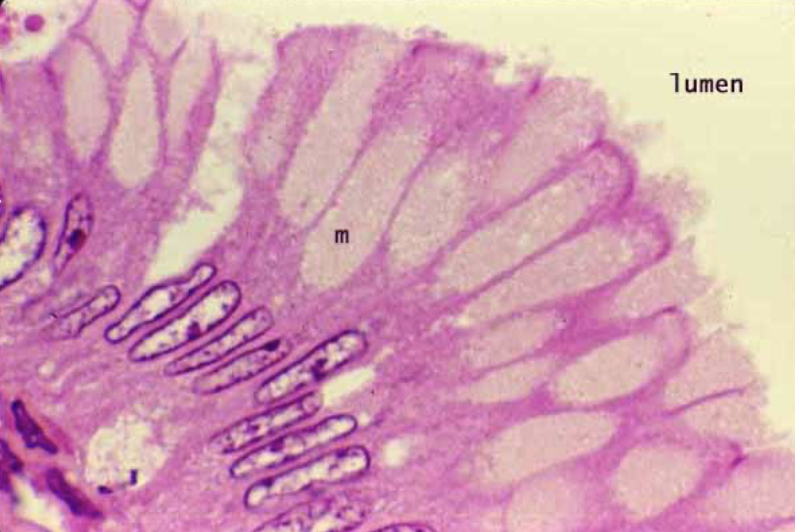 Till skillnad från andra mukösa celler så är cellkärnan inte tryckt mot cellens BM utan lokaliserad ganska centralt