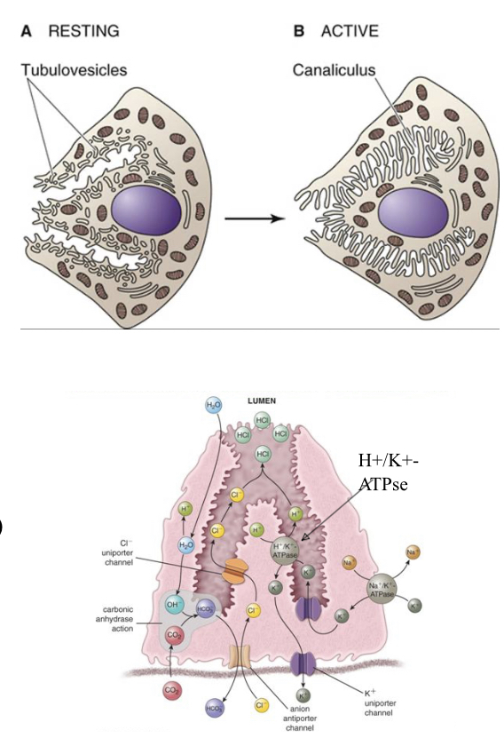HCl-produktionen medieras av en protinpump, ett K+/H+-ATPase, som pumpar vätejoner över plasmamembranet till canaliculus → måltavla för Losec (omeprazol), ett läkemdel mot magsår och gastrit