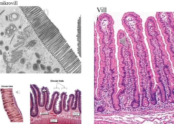 Mikrovilli — membranprojektioner med en kärna av aktinfilament och cytoplasma — förstorar ytan på epitelcellers apikala membran vilket ökar absorptionen — ca 3000 microvilli per cell