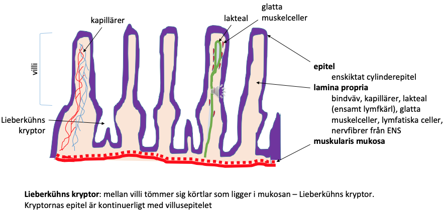 Villi — fingerliknande mm-långa projektioner som kraftigt ökar tunntarmens yta — består av epitel och lamina propria, muscularis mucosa och submucosa omfattas inte