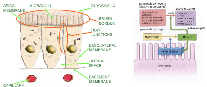 Brush border (stavbräm) av mikrovilli och glykokalyx, tight junctions med intilliggande celler