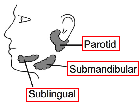 Serous cells - Secrete watery substance which contains amylase (breaks down starch around teeth) and lysozyme (breaks down bacteria)